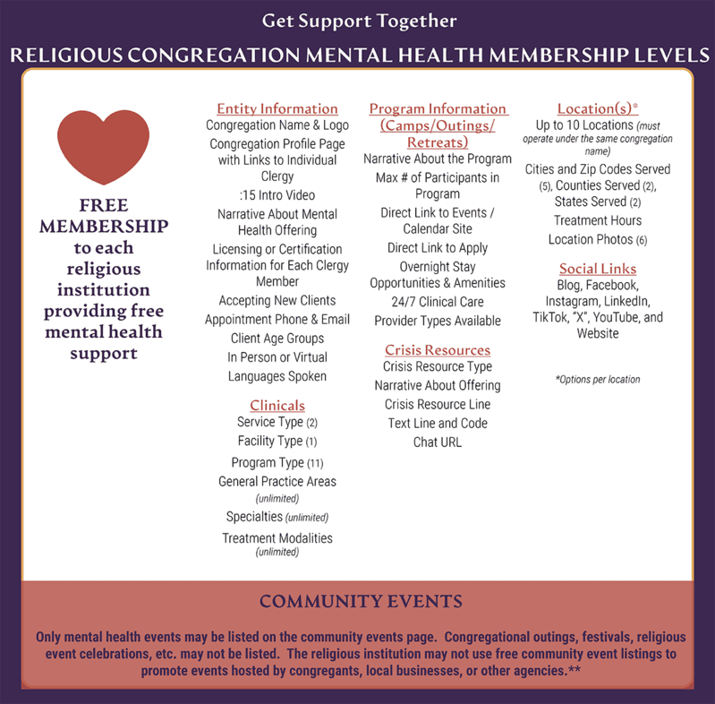 To qualify for the free religious congregation listing, you must have a designated place of worship with at least one clergy (pastor, rabbi, iman, etc.) licensed by the American Association of Pastoral Counselors, a Certified Chaplin, or be degreed by a university with a Masters in social work, LPC, etc.). Get Support Together is not a fundraising platform and will be utilized to match your publicly available mental health counseling services or programs to individuals in need. The congregation must have regularly scheduled worship services and no private profit or political campaigning may be done with the congregation. All mental health services must be provided free of charge and counseling must be faith based. Use of the free listing is limited to sharing messages about mental health services, not congregational events or regular worship. Multiple locations may be listed under one account as long as they serve under the same name. At most two administrators will be permitted to access the entirety of the congregation’s offerings and individual clergy may manage their own listing.